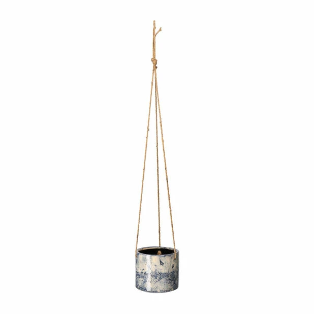 Moderne, håndlaget ampel med spettet mønster i blått og hvitt. Perfekt når du vil innrede i høyden med planter i potter med unikt design! Med oppheng i jute, fås også som vanlig potte.