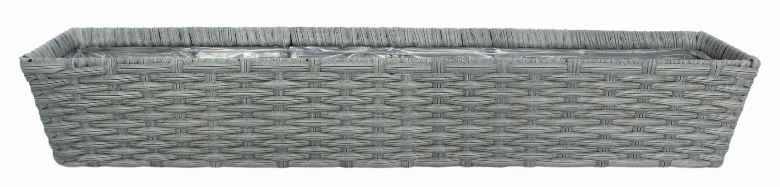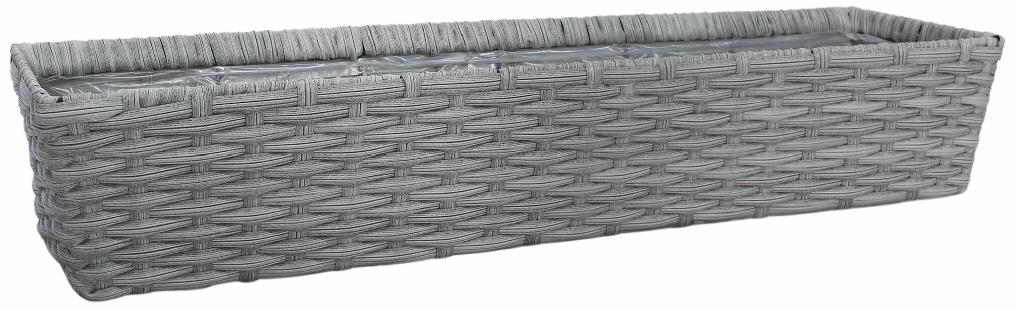 Balkongkasse i moderne, flettet kunstrotting med plastbelagt innside. Perfekt i kombinasjon med en rottinggruppe eller alene som balkongkasse. Lengde: 92, bredde 21cm, høyde: 15 cm.