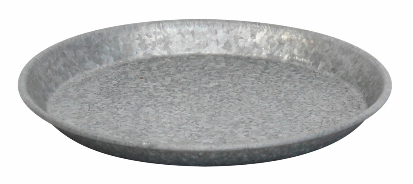 Rundt, vanntett fat i matt sink som beskytter terrassen mot fukt og søl fra utepotter. Passer også til innendørs bruk. Diameter 22 cm. Fås i flere størrelser.