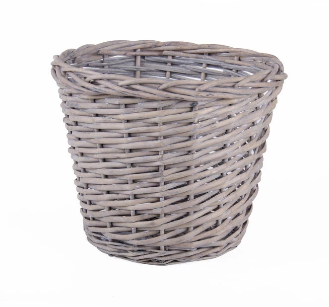 En tradisjonell kurv i grå pil, plastbelagt på innisden. Utmerket som potteskjuler ute som inne. Diameter 32cm, høyde 29cm.