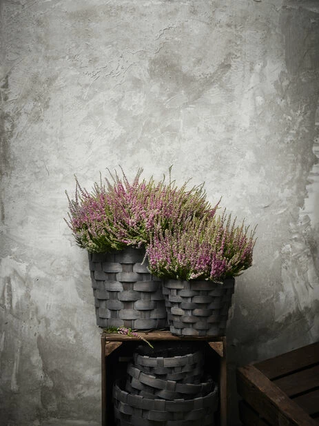 Kurv av flettet tre, plastbelagt på innsiden. Passer godt til våre tette og frodige krysantemum.