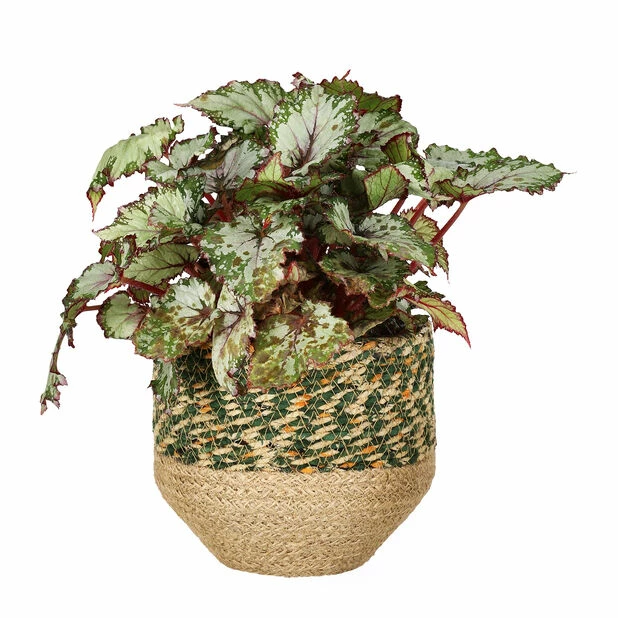 Flott og unik kurv fremstilt av naturmateriale med lekre detaljer av bomull som er laget av rester fra t-skjorteproduksjon. Beregnet til innendørsbruk. Potten har en tynn plastinnsats, men den bør kombineres med en tett innerpotte, et potteunderlag eller vanntett fat som beskytter mot fukt på underlag. Mål: Ø15 cm, høyde: 13 cm.