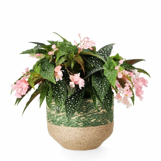 Flott og unik kurv fremstilt av naturmateriale med lekre detaljer av bomull som er laget av rester fra t-skjorteproduksjon. Beregnet til innendørsbruk. Potten har en tynn plastinnsats, men den bør kombineres med en tett innerpotte, et potteunderlag eller vanntett fat som beskytter mot fukt på underlag. Mål: Ø17 cm, høyde: 15 cm.