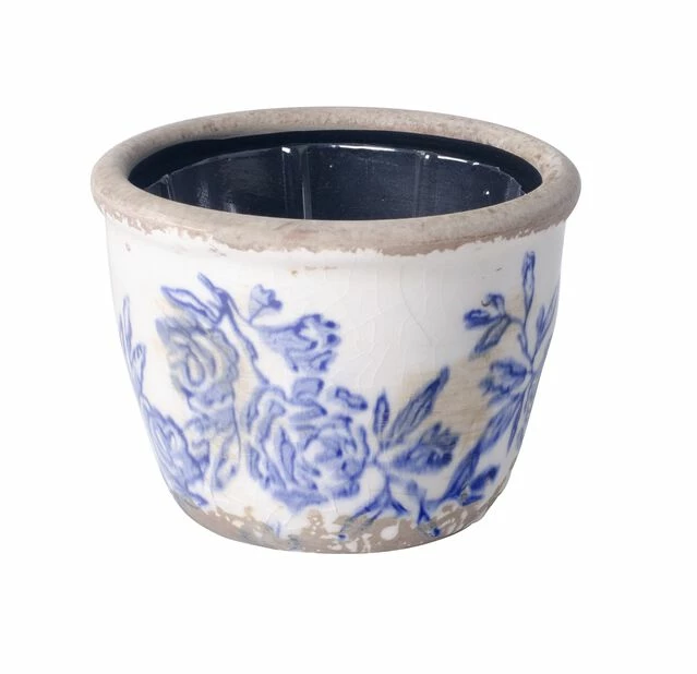 Tradisjonell potte i keramikk med antikkbehandling. Til innendørs bruk. Håndmalt hver potte er unik. Ø 9 cm og 7 cm høy, passer til 6 cm miniplanter. Plastbelagt innside gjør potten vanntett. Med plastbelagt innside for å sikre vanntetthet.