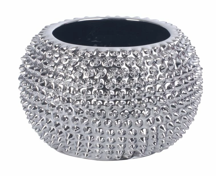 Moderne, lekker potte i glasert keramikk med taggete overflate i relief. For innendørsbruk. Finnes i fargene blå, sølv og svart.