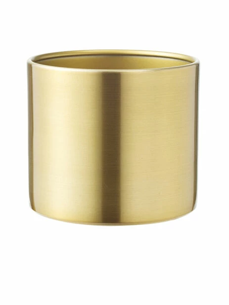 Stilren, messingfarget potte i aluminium. Lett å håndtere. Diameter: 12 cm, høyde: 10,5 cm. Passer til innerpotte med diameter 10 cm.
