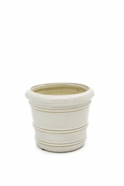 Flott, rund og klassisk potte med dekorative riller. Fremstilt av keramikk med blankglasert overflate. Beregnet til innendørsbruk. Mål: Ø15,5 cm, høyde: 13 cm.