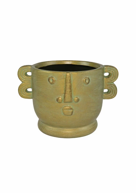 Vakkert stengods! Fin potte i keramikk med lekkert design i form av et ansikt. Potten er håndlaget og håndmalt i en matt gullfarge. Diameter: 13 cm, høyde: 12 cm. Passer til innerpotte med diameter 10,5 cm.