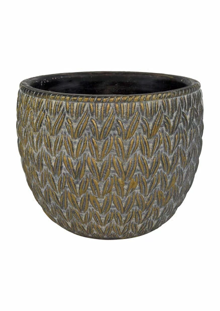 Vakker betongpotte i grått og gull. Håndlaget og håndmalt, med en matt overflate. Har en plastinnsats som beskytter mot fukt. Diameter: 15,5 cm, høyde: 19 cm. Passer til innerpotte med diameter 14 cm.