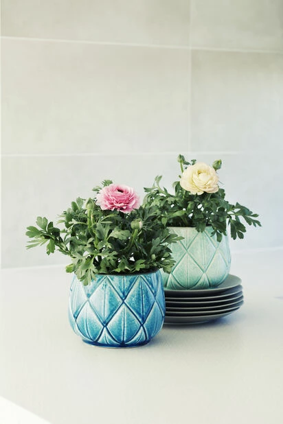 Moderne potte i flotte farger. Fin, glansfull overflate og rombemønster i relieff. Finnes i flere størrelser og farger. Ikke fjern plastinnsatsen fra potten, den gjør potten vanntett.