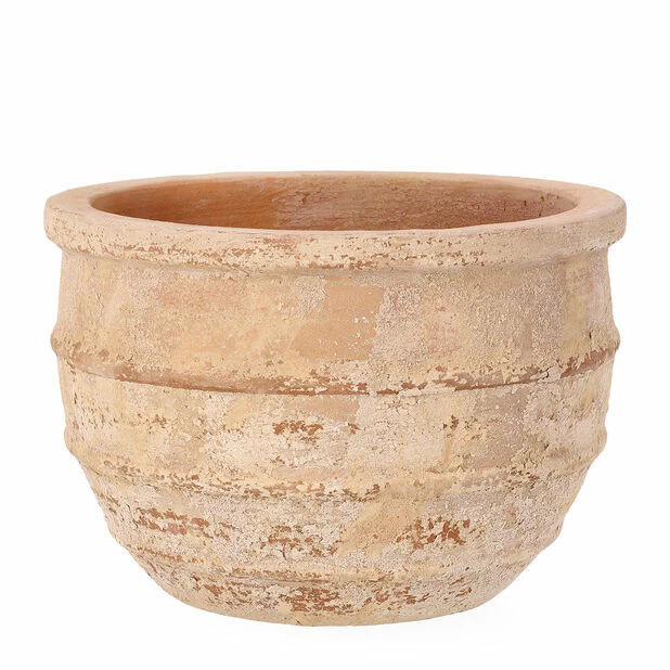 Rustikk og dekorativ terrakotta potte med stilige riller som gir potten et antikt utseende. Beregnet til utendørsbruk. Diameter: 22 cm, høyde: 15 cm. Frostsikker med dreneringshull i bunnen.