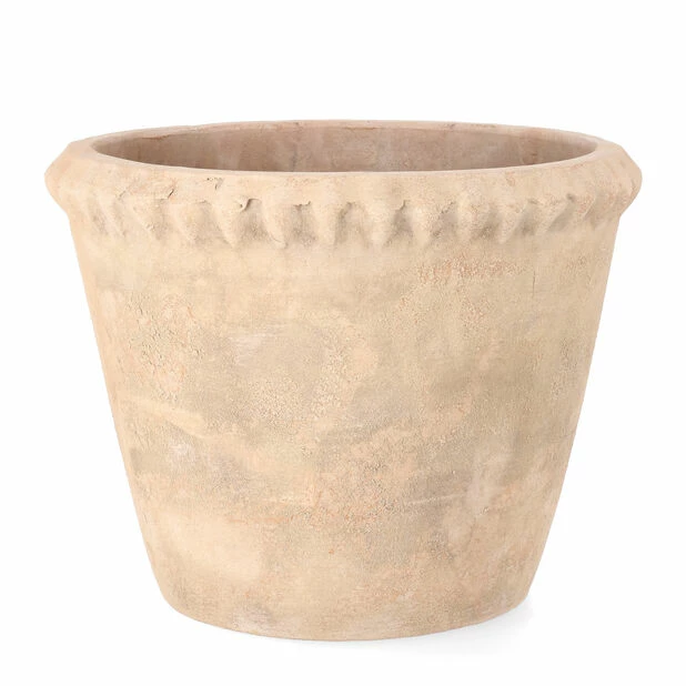 Rustikk terrakottakrukke med vintagelook, matt finish og søte border rundt kanten øverst på potten. Beregnet til utendørsbruk. Diameter: 45 cm, høyde: 36 cm. Frostsikker med dreneringshull i bunnen.
