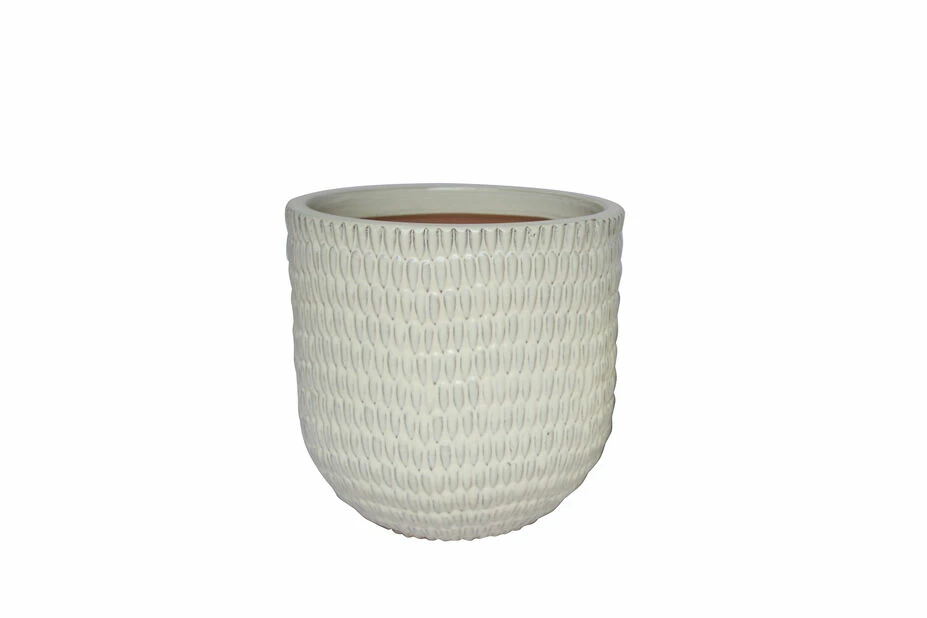 Leonora er en håndlaget terrakotta-potte med fint, glasert struktumønster, der hver potte er unik. Potten er beregnet på utendørsbruk, har dreneringshull og er frostsikker. Diameter: 27 cm, høyde: 27 cm.