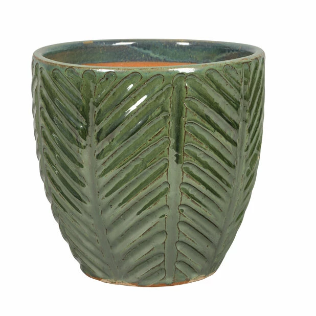 Fin, rund potte i keramikk med dekorativt fiskebeinsmønster og blankglasert finish. Beregnet for utendørsbruk. Diameter: 22 cm, høyde: 21 cm. Frostsikker med dreneringshull i bunnen.
