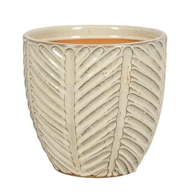 Fin, rund potte i keramikk med dekorativt fiskebeinsmønster og blankglasert finish. Beregnet for utendørsbruk. Diameter: 38 cm, høyde: 34 cm. Frostsikker med dreneringshull i bunnen.