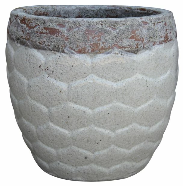 Glasert leirpotte med fint strukturmønster i herlig offwhite farge med brun kant. Håndlaget – hver potte er unik. Frostsikker potte til utendørs bruk med dreneringshull. Mål: Ø 42 cm X H 42 cm med innvendig mål på Ø 32 cm.