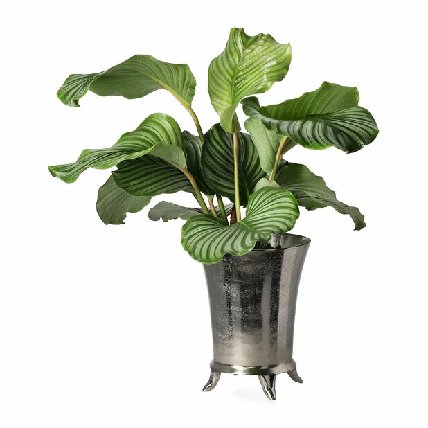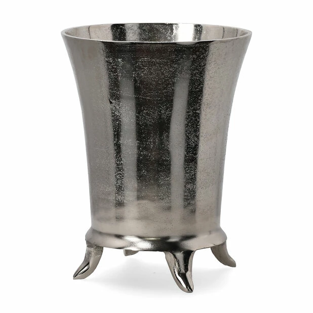 Klassisk høy potte i blank sølvfarget aluminium med ben nederst. Passer perfekt til høye planter som orkidéer. Beregnet til innendørsbruk. Mål: Ø24 cm, høyde: 31 cm.