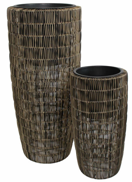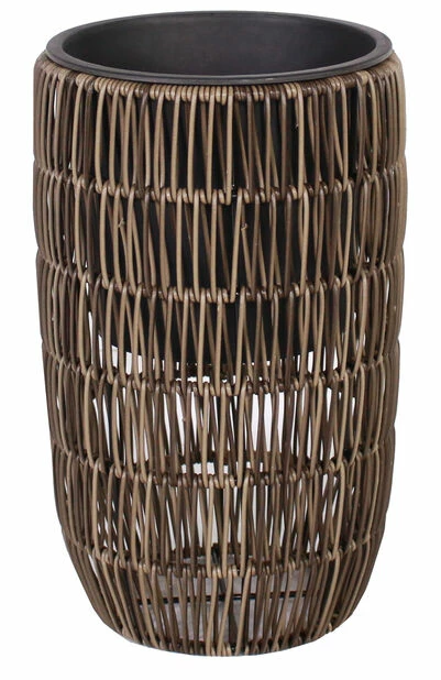 En moderne potte i flettet kunstrotting. Potten er høy med matchende, svart plastinnsats. Innsatsen har ikke dreneringshull, men det er enkelt å lage. D: 30 cm, H: 60 cm.