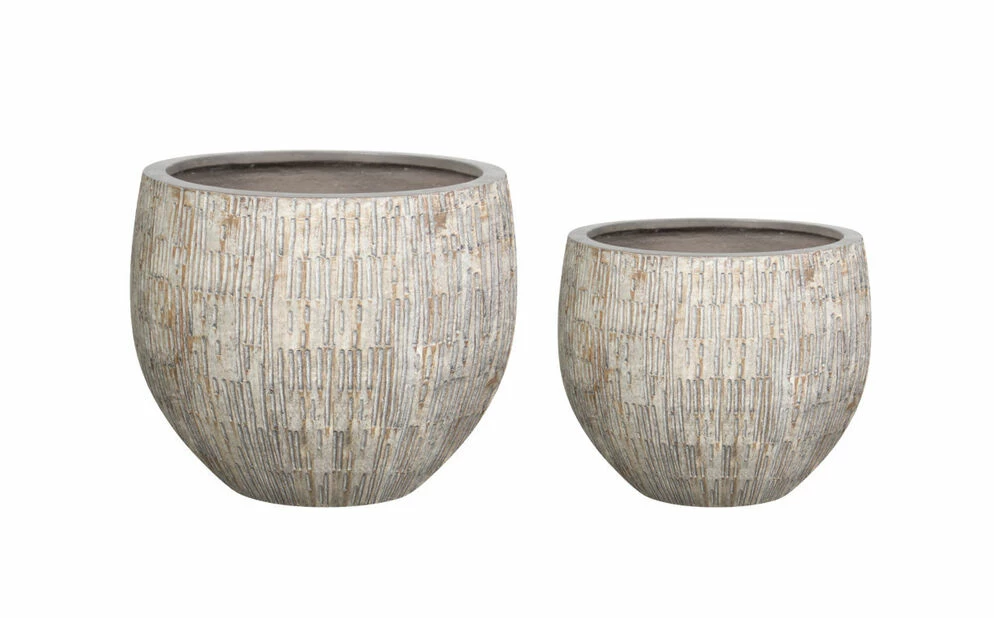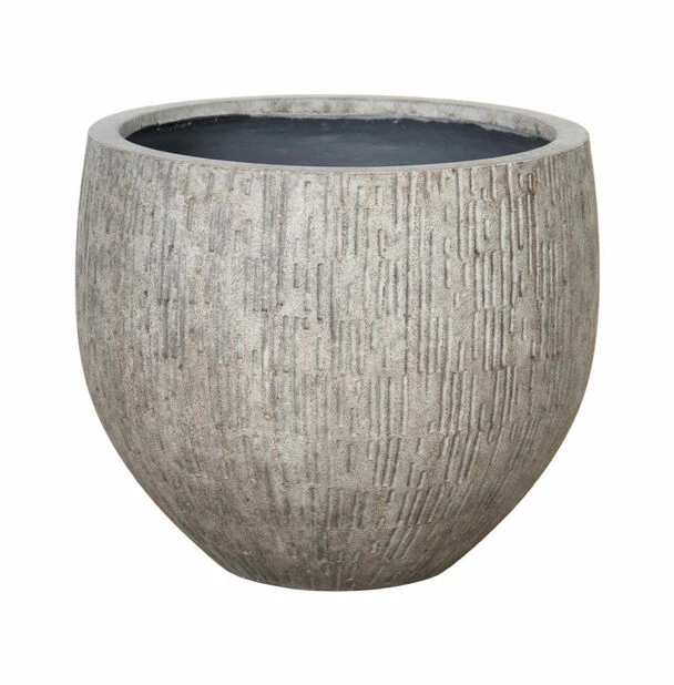 Potte Milo av glassfiber, sement, sand og stein gir en lett potte som dessuten er robust og ikke minst vakker. Skålen har et spennende, lineært mønster. Har dreneringshull. Frostsikker. D 44 cm x H 26 cm.
