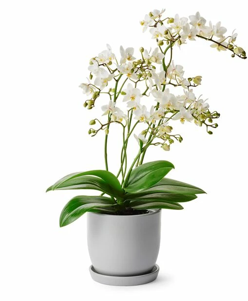 En potte med fat i glasert matt lysegrå keramikk. Passer perfekt til orkideer Ø 12 cm. Finnes i to farger, lysegrå og lysegrønn, Ø 14 cm og 13 cm høy.