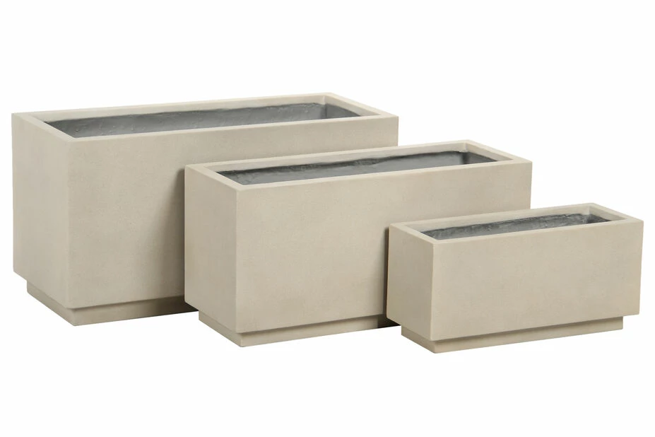 Moderne og stilig rektangulær plantekasse for utendørsbruk. I frostssikker lettsement med dreneringshull. Lengde 76 cm. Nova-fatet med lengde 76 cm passer her.