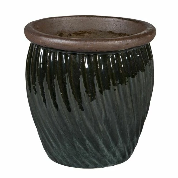 Moderne og lekfull keramikkpotte i vakker grønnfarge med dekorative linjer og glasering som skinner vakkert i solen. Frostsikker med dreneringshull i bunnen. Mål: Ø40 cm, høyde: 40 cm.