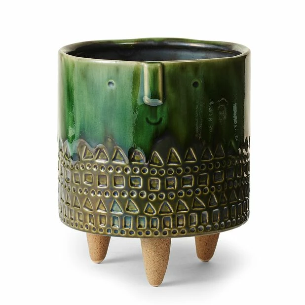 Sjarmerende, håndlaget keramikkpotte med glatt ansiktsmønster på treben. Potten er håndlaget, som gjør hvert eksemplar unikt. Vanntett potte til innendørs bruk. Ø 15 cm, høyde 17 cm. Passer til Ø 12 cm innerpotter/planter.