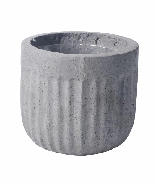 Håndlaget, tradisjonell rustikk potte i grå betong med strukturmønster. Ø 17 cm og 15,5 cm høy, passer til 12 cm innerpotter. Potten har en tynn plastinnsats, men den bør kombineres med en tett innerpotte, et potteunderlag eller vanntett fat som beskytter mot fukt på underlag. Til innendørs bruk.