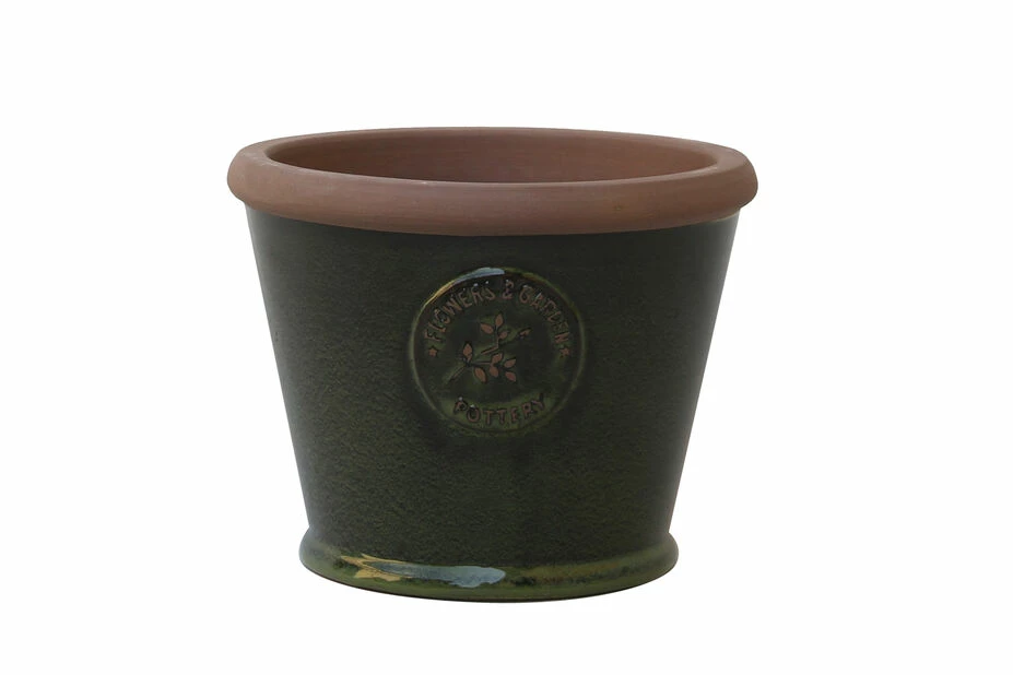 Klassisk potte i flott mørkegrønn glasert keramikk med fint emblem og terrakottafarget kant. Høyde 19 cm, diameter 25 cm, passer til planter med innerpotter med diameter på 21 cm. Til innen- og utendørs bruk, i kombinasjon med tilhørende Svea terrakottafat. Fås i flere farger og størrelser.