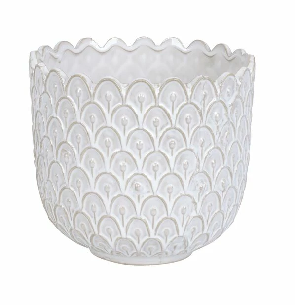 Håndlaget keramikkpotte med vakkert strukturmønster i hvitt. Victoriapotten er håndlaget, som gjør hvert eksemplar unikt. Vanntett potte til innendørs bruk. Ø 17,5 cm, høyde 16 cm. Passer til Ø 14 cm innerpotter/planter. Finnes også i blått og Ø 17 cm.