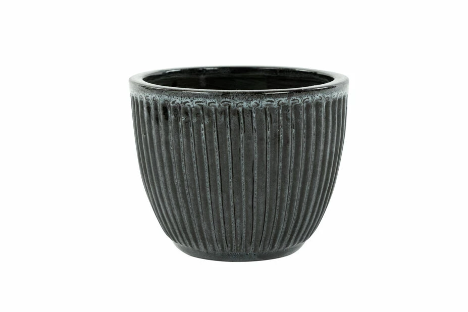 Pottesett med to blå utepotter i moderne design med stilrene riller og blank, glasert finish. Utepotte med dreneringshull. Selges i 2-pakning med to ulike størrelser – velg mellom tre stilrene farger.