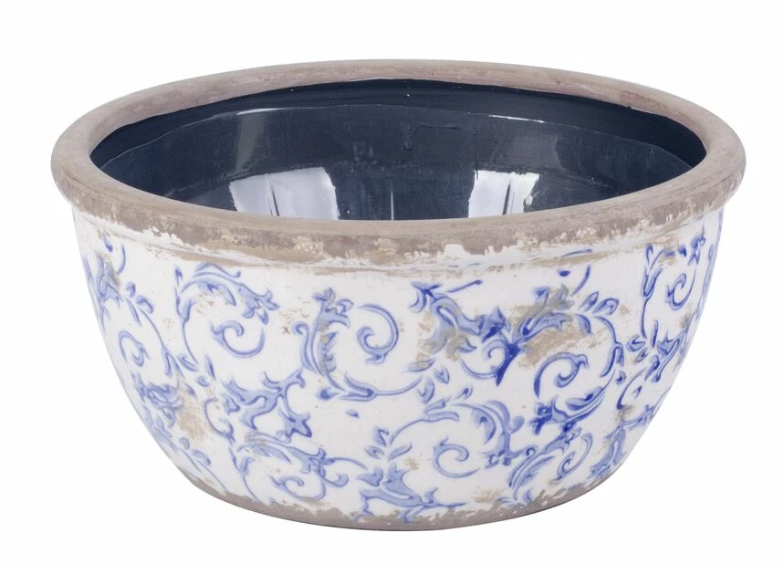 Tradisjonell skål i hvit keramikk med blått blomstermotiv. For innendørsbruk. Håndlaget. Passer perfekt til plastskåler med Ø17 cm. Finnes i to størrelser.