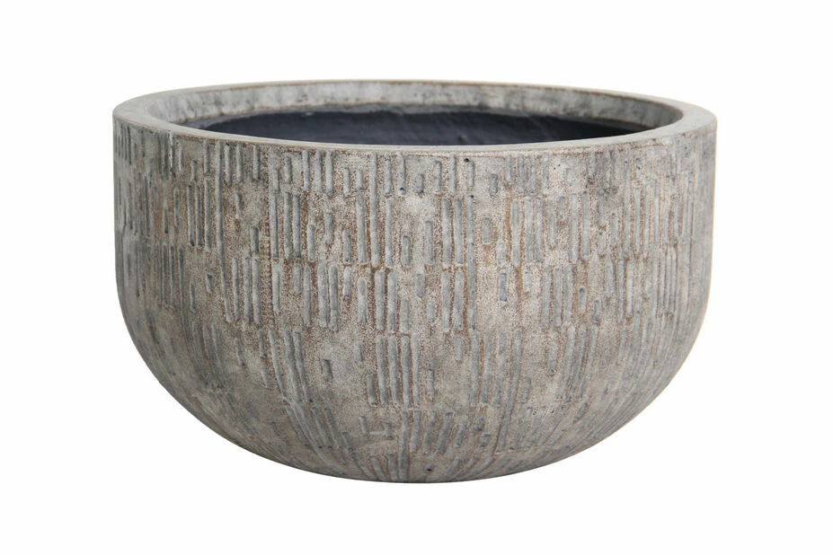 Skål Milo av glassfiber, sement, sand og stein gir en lett skål som dessuten er robust og ikke minst vakker. Skålen har et spennende, lineært mønster. Har dreneringshull. Frostsikker. D 35 cm x H 23 cm.